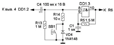 И, наконец, в случае отсутствия в схеме базового устройства свободного логического элемента для отключения звукового сигнала через установленный промежуток времени можно воспользоваться схемой, приведённой на рис. 5. Вновь введённый узел представляет собой дифференцирующую цепь, длительность импульса на выходе которой зависит от ёмкости конденсатора С4 и сопротивления резистора R13. Диод VD4 и резистор R14, как и в предыдущих схемах, служат для ускоренной разрядки конденсатора С4 при появлении на входе узла низкого логического уровня.
