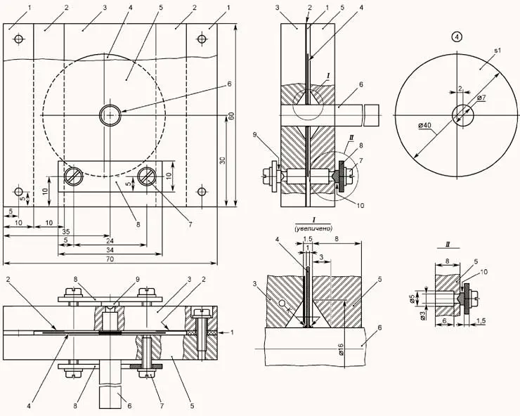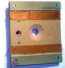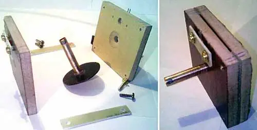 Фигурная заслонка 4 (в данном случае круг со смещённым на 2 мм центром) изготовлена из непрозрачной пластмассы толщиной, примерно на 0,5 мм меньшей, чем прокладки 1, и закреплена с помощью клея "Момент" на пустотелом латунном валике 6 (использовано колено с наружным диаметром 7 мм от телескопической антенны). Эта деталь ОАПР может быть изготовлена и из сплошного металла (из прутка диаметром 6...7 мм). Для того чтобы заслонка вращалась без люфта и не изменяла своего положения самопроизвольно, отверстия под валик 6 в стенках 3 и 5 необходимо изготовить возможно точнее, с минимальным зазором, а к стенке 3 с внутренней стороны надо приклеить полоски тонкой ткани 2 (рис. 2), которые будут выполнять функции тормозных устройств заслонки. Внешний вид одного из вариантов ОАПР показан на рис. 3.