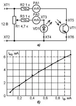 Рис. 5. Схема измерений (а) и передаточная характеристика (б) ОАПР с компонентами оптопары из пожарного дымового извещателя ИП-212