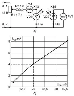 После сборки устройства следует снять его передаточную характеристику - зависимость тока фотоприёмника Iф (или напряжения на нём Uф) от тока через излучающий диод Iид при "открытой" заслонке (когда она находится в положении минимального влияния на световой поток от излучающего диода к фотоприёмнику) для возможной коррекции схемы устройства, в котором предполагается использовать ОАПР. В качестве примера на рис. 4 представлены схема измерений (а) и передаточная характеристика (б) ОАПР с компонентами оптопары от датчика бумаги принтера, а на рис. 5 - то же, с компонентами оптопары из пожарного дымового извещателя ИП-212 выпуска 2009 г. В обоих случаях ток через излучающий диод VD1 регулируют переменным резистором R1, а измеряют в первом случае миллиамперметром PA2, а во втором - PA1. Для измерения тока фотоприёмника используют миллиамперметр PA1 (см. рис. 4), а для измерения напряжения на нём - милливольтметр PV1.