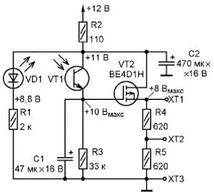 Схема одного из устройств, в котором испытывался ОАПР, - формирователя управляющего напряжения на полевом транзисторе BE4D1H показана на рис. 6. Элементы оптопары извлечены из узлов с маркировкой IA34LG или ONI350, применяемых в принтерах. Рабочая точка оптопары выбрана в верхней части передаточной характеристики. При необходимости напряжение питания устройства можно увеличить, скорректировав соответствующим образом ток через излучающий диод VD1. Входное сопротивление повторителя на транзисторе VT2 при низком напряжении на затворе довольно велико (больше 20 кОм), поэтому может потребоваться экранирование проводов, идущих к фототранзистору VT1. Устройство испытывалось для непосредственного управления уровнем звука. Результат отрицательный (велик уровень шумов).