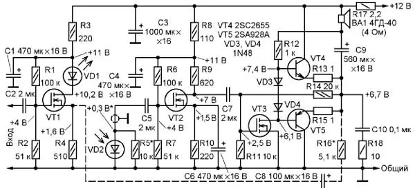 Налаживание усилителя сводится к проверке указанных на схеме значений напряжения (измерены прибором Ц4353 при напряжении питания 12 В; напряжение на истоке транзистора VT1 - по шкале 3 В). Отрицательную ОС подбирают на слух, изменяя сопротивление резистора R16 в пределах от 7 до 2 кОм. Коэффициент усиления по напряжению можно уменьшить до 2.