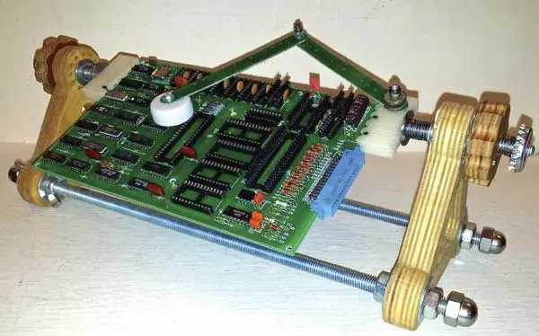 Стойки 8 выпилены лобзиком из берёзовой фанеры толщиной 20 мм. Если фанеры такой толщины нет, можно набрать её, склеив клеем ПВА заготовки из тонкой фанеры. Готовые стойки обработаны начисто напильником и наждачной бумагой, а затем покрыты растительным или другим маслом, которое со временем впитывается в древесину и полимеризуется. Шпильки с резьбой М10 и фанера толщиной 20 мм обеспечивают достаточные для комфортной работы массу и жёсткость конструкции.
