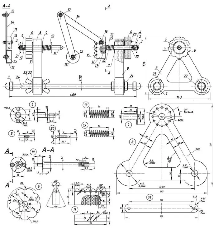 На рис. 2 изображены сборочный чертёж держателя и его деталировка. Основание держателя образуют две направляющие шпильки 24 с резьбой М10 и две стойки 8. Одна из стоек неподвижно закреплена на шпильках 24 гайками 21 через шайбы 22, а другую можно перемещать вдоль шпилек и фиксировать в нужном положении гайками-барашками 23. Детали 4, 9, 10 выточены из стали на токарном станке. В качестве не показанных на рис. 2 ножек держателя печатных плат можно использовать самоклеящиеся силиконовые прокладки под ножки мебели.