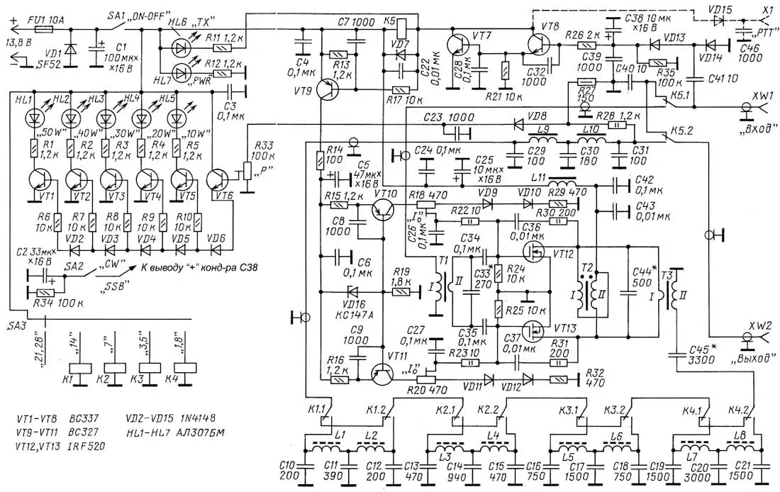 Рассмотрим работу усилителя мощности, схема которого приведена на рис. 1. Когда питание на усилитель не подано (переключатель SA1 разомкнут), входной разъём XW1 через контакты реле К5.1 и К5.2 соединён с выходным разъёмом XW2 и усилитель находится в режиме "обход". Конденсатор С40 улучшает "проходной" КСВ усилителя, особенно на ВЧ-диапазонах. При включении питания каскад автоматического перехода на передачу (ВЧ VOX), выполненный на элементах VT7, VT8, VD13, VD14 и реле К5, готов к работе. Как только на входном разъёме появится сигнал мощностью 0,1 Вт и более, сработает реле К5 и усилитель перейдёт в режим "передача", загорится светодиод HL6 "ТХ". При этом входной сигнал через контакты реле К5.1 поступит на первичную обмотку трансформатора Т1, а вторая группа контактов реле К5.2 соединит выход усилителя (выход ФНЧ) с выходным разъёмом XW2. Время отпускания ВЧ VOX и, соответственно, время перехода усилителя в режим "приём" зависит от ёмкости конденсатора С38. Поэтому в режиме SSB желательно это время увеличить, чтобы в паузах быстро меняющегося голосового сигнала усилитель не переходил в режим "приём". Для этого переключателем SA2 параллельно С38 подключается конденсатор С2 с разрядным резистором R34.