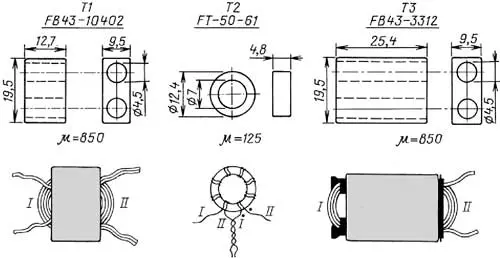 Намоточные данные катушек ФНЧ приведены в табл. 1. Витки на кольцах нужно стараться распределять так, чтобы максимально заполнить их периметр. Данные трансформаторов Т1-Т3 приведены в табл. 2. От качества их изготовления во многом зависит АЧХ усилителя. Однако это не означает, что нужно обязательно применять только такие магнитопроводы, как показано на рис. 2. "Бинокли" трансформаторов Т1 и Т3 вполне можно заменить столбиками из колец с магнитной проницаемостью 600... 1000 и диаметром 10...12 мм (методика изготовления многократно описана). Трансформатор Т2 можно выполнить на любом схожем по габаритам кольце с проницаемостью 100...600. Дроссель L11 - 8 витков проводом ПЭВ-2 0,8 на кольцевом магнитопроводе диаметром 10 мм с магнитной проницаемостью 600...2000 (не критично). Реле К1-К5 - производства компании TIANBO HJR-1-2C-L-12V с двумя группами переключаемых контактов. Параллельно обмоткам реле К1-К4 подключены конденсаторы и диоды (на схеме рис. 1 они не показаны) по аналогии с обмоткой реле К5.