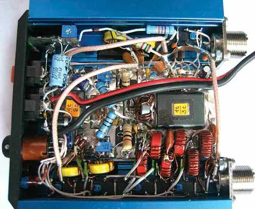 Плата собственно усилителя установлена в центре корпуса, а реле К1 - К5 приклеены к стенкам корпуса по периметру платы. Реле К5 установлено сразу за разъёмом XW1, а реле К1-К4 - вдоль боковой стенки за разъёмом XW2. Детали ФНЧ смонтированы навесным способом на выводах контактов реле, а затем приклеены клеем БФ к корпусам реле и шасси (корпусу-теплоотводу). Также навесным способом смонтированы элементы R27, R28, R30, R31, C36, C37, VD8.