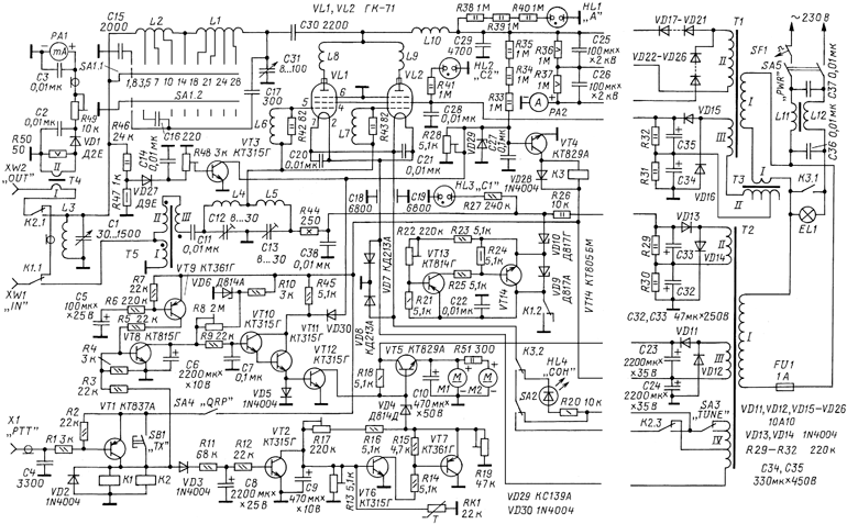 Широкополосный трансформатор Т5 на входе усилителя обеспечивает согласование с КСВ не более 1,5 на всех диапазонах с любым импортным трансивером, даже не имеющим встроенного антенного тюнера. ФНЧ L4L5C12C13 с частотой среза 32 МГц компенсирует входную ёмкость ламп ГК-71 на ВЧ-диапазонах.