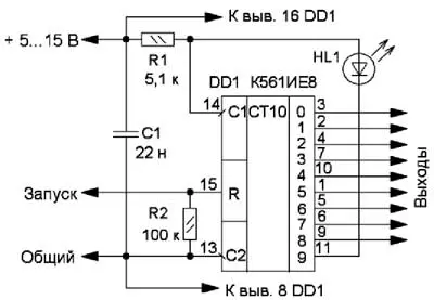 Схема несложного импульсного генератора приведена на рис. 1. Основой устройства служит десятичный счётчик К561ИЕ8 (К176ИЕ8, К561ИЕ9 или импортный аналог), на счётный вход которого поступают импульсы от мигающего светодиода HL1. При подаче питающего напряжения счётчик DD1 может установиться в произвольное состояние, и тактовый генератор на мигающем светодиоде HL1 будет работать до появления на выходе 9 (вывод 11) высокого логического уровня, после чего счётчик останавливается и генератор переходит в ждущий режим. При подаче на вход R микросхемы DD1 импульса c высоким логическим уровнем счётчик устанавливается в нулевое состояние и на его выходе 9 появляется низкий логический уровень. Генератор на мигающем светодиоде начинает работу, и по окончании обнуляющего импульса на выходах счётчика последовательно появляются импульсы.
