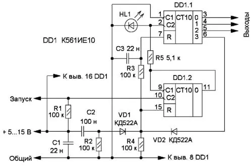 После запуска тактового генератора на мигающем светодиоде HL1 счётчик DD1.1 подсчитывает его импульсы, и на выходах 0-3 счётчика появляется последовательность выходных импульсов в двоичном коде. При появлении высокого логического уровня на выходе 3 этого счётчика напряжение через диод VD2 поступает на входы сброса обоих счётчиков и устанавливает их в нулевое состояние. Интегрирующая цепь R3C3 предназначена для обеспечения сброса обоих счётчиков микросхемы.