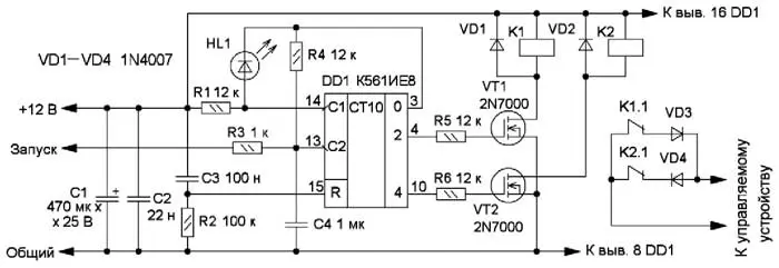 Третий генератор был разработан для управления устройством [3] с помощью устройства дистанционного управления [4]. Квыходам 2 и 4счётчика DD1 подключены затворы полевых транзисторов VT1 и VT2, в цепи стока которых включены обмотки реле К1 и К2. Нормально замкнутые контакты этих реле через диоды VD3, VD4 включены в разрыв линии устройства [3], а вход "Запуск" генератора подключён к выходу "*" устройства [4]. Таким образом, при появлении на этом входе низкого логического уровня оба реле последовательно размыкают свои контакты, разрывая сначала один, а потом другой полупериод напряжения в линии, поэтому устройство [3] включает или выключает подключённые к нему осветительные лампы.