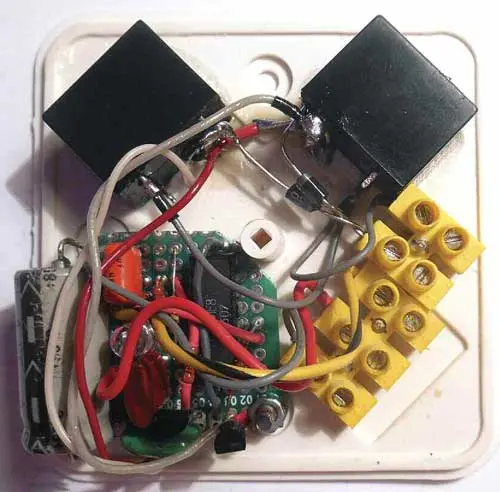 Так как деталей в устройстве немного, печатная плата для него не разрабатывалась, а все элементы были смонтированы на отрезке универсальной макетной платы,которая совместно с реле и клеммной колодкой, служащей для подключения внешних цепей, помещена в пластмассовую распаячную коробку размерами 20x75x75 мм (рис. 6). В устройстве можно применить микросхемы серий К561, КР1561 или их импортные аналоги, транзисторы 2N7000 можно заменить отечественными КП505 или использовать биполярные транзисторы структуры n-p-n, например, КТ315 или КТ3102. Остальные детали - любые подходящие, выбор реле зависит от питающего устройство напряжения; в авторском варианте применены реле SANOU SRD-S-112 D.