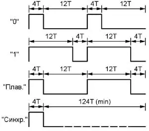 Для передачи по радиоканалу значения разрядов слова закодированы в соответствии с рис. 2. Длительность передачи каждого разряда - 32T, где T - период повторения импульсов внутреннего тактового генератора микросхемы. Его обычно устанавливают равным 50...100 мкс. Разряд со значением ноль - дважды повторённая последовательность импульса длительностью 4T и паузы длительностью 12T. При передаче единицы последовательность обратная - импульсы длительностью 12T разделены паузами длительностью 4Т. "Плавающему" состоянию соответствует последовательность: импульс 4T, пауза 12T, импульс 12T, пауза 4Т. Завершает передачу кодового слова синхроимпульс длительностью 4T, за которым следует пауза длительностью минимум 124T.