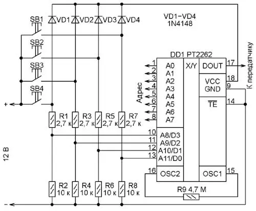 Рис. 3. Схема кодера системы дистанционного управления на микросхеме PT2262 (DD1)