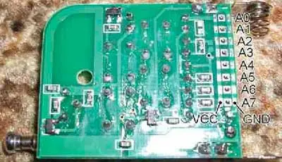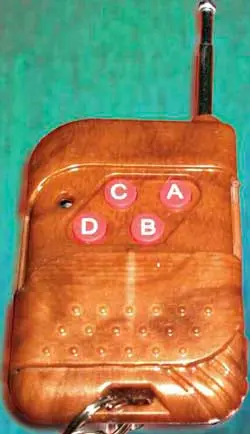 В продаваемых комплектах аппаратуры радиоуправления передатчик выполнен, как правило, в виде малогабаритного пульта, к которому можно прикрепить, например, брелок с ключами (рис. 4). На рис. 5 на плате передатчика видны восемь контактных площадок для установки адреса.