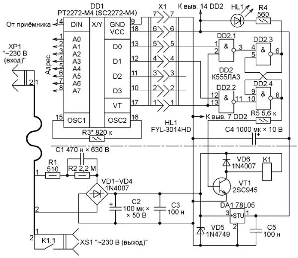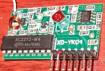 Принципиальная схема декодера системы радиоуправления с узлом управления исполнительным устройством (розеткой) показана на рис. 6. Здесь применён готовый модуль приёмника XD-YK04-M4-315MHz (рис. 7) из приобретённого набора. В нём установлена микросхема декодера SC2272-M4 (полный аналог PT2272-M4). Из имеющихся в модуле элементов на схеме показаны только эта микросхема (DD1) и разъём X1, которым модуль подключают к внешним цепям. Адресные входы декодера должны быть распаяны аналогично адресным входам кодера в пульте управления, только в этом случае декодер сможет опознать отправленную ему команду. Достоверность принятой команды подтверждает высокий логический уровень на выходе VT декодера.