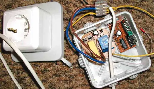 Приёмная часть устройства радиоуправления собрана в электромонтажной коробке размерами 100x100x50 мм, на крышке которой установлена обычная сетевая розетка для открытой проводки ХS1. Внутри коробки размещены три платы. Находящаяся на плате модуля приёмника штыревая часть разъёма X1 вставлена в его гнездовую часть, установленную на макетной плате с триггером на микросхеме DD2. Плата с транзистором VT1, реле K1 и узлом питания - от неисправного датчика движения ДД-009, на которой исходно установленный интегральный стабилизатор 78L09 заменён на 78L05. На схеме (см. рис. 6) находящиеся на этой плате детали расположены ниже штрихпунктирной линии. Внешний вид конструкции показан на рис. 8.