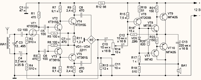 Сигнал ЗЧ через конденсатор С10 поступает на регулятор громкости R14 и затем на вход УМЗЧ, собранного на транзисторах VT6-VT10 по известной схеме. Максимальная выходная мощность усилителя - 150 мВт.