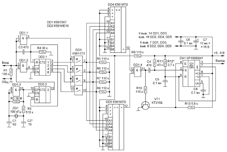 Резисторы R5-R8 образуют формирователь цифрового кода U4. При размыкании ключей микросхемы DD3 эти резисторы отключаются от соответствующих выходов двоичного счётчика DD2.1, в результате чего на выводах резисторов R5-R8, соединённых с входами A1, A2, A4, A8 цифровых компараторов DD4, DD5, формируется двоичное четырёхразрядное число N0 = 00002 (010). При замыкании ключей микросхемы DD3 резисторы R5-R8 становятся нагрузочными для соответствующих выходов двоичного счётчика DD2.1, формирующего двоичное четырёхразрядное число Nx, подаваемое на входы A1, A2, A4, A8 цифровых компараторов DD4, DD5.
