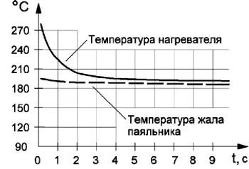 Рис. 1. Графики изменения температуры нагревателя и жала паяльника с момента выключения нагревателя