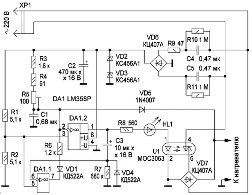 Светодиод HL1, диоды VD1, VD4 - любые маломощные. Диод VD5 - любого типа на напряжение не менее 400 В. Стабилитроны КС456А1 заменимы на КС456А или один стабилитрон на 12 В с максимально допустимым током более 100 мА. Оксидный конденсатор С3 надо обязательно проверить на утечку. При проверке конденсатора омметром его сопротивление должно быть больше 2 МОм. Конденсаторы С4, С5 - импортные плёночные на переменное напряжение 250 В или отечественные К73-17 на напряжение 400 В. Микросхема LM358P заменима на LM393P В этом случае правый по схеме вывод резистора R8 необходимо подключить к плюсовой линии питания узла управления, а анод светодиода HL1 - непосредственно к выходу DA1.2 (выводу 1). При этом диод VD1 можно не ставить. Сопротивление резистора R6 должно выбираться исходя из имеющегося нагревателя. Оно должно быть меньше сопротивления нагревателя в холодном состоянии примерно на 10 %. Сопротивление подстроечного резистора R5 выбирают так, чтобы интервал регулировки температуры не превышал 100 оС. Для этого вычисляют разность сопротивлений холодного и хорошо прогретого паяльника и умножают её на 3,5. Полученное значение и будет сопротивлением резистора R5 в омах. Тип резистора - любой многооборотный.