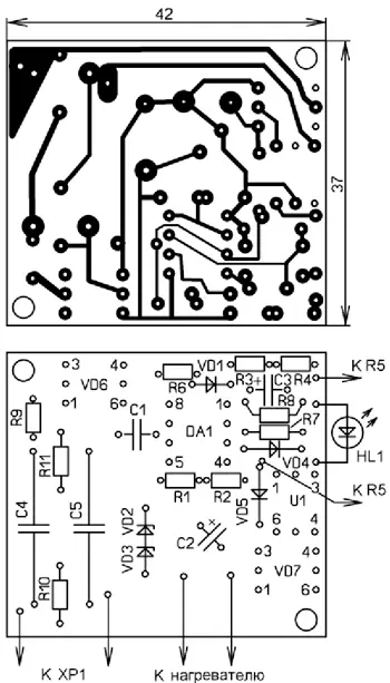 Печатная плата размерами 42x37 мм изготовлена из односторонне фольгированного стеклотекстолита. Её чертёж и расположение элементов приведены на рис. 3.