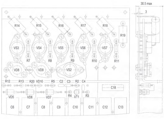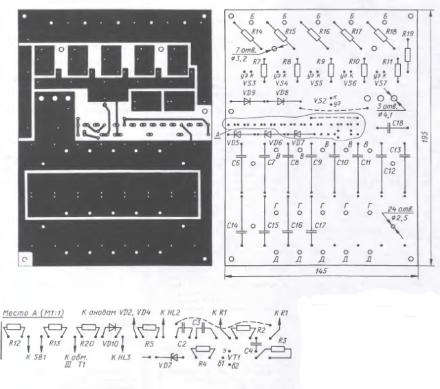 Все резисторы (кроме R1 и R6), конденсаторы С2-С4, С6-С18, транзистор VT1, тринисторы VS2- VS7, стабилитроны VD5-VD7, диоды VD8-VD10 смонтированы на основной печатной плате, причем тринисторы и диоды VD8, VD9 установлены на теплоотводе, привинченном к плате.