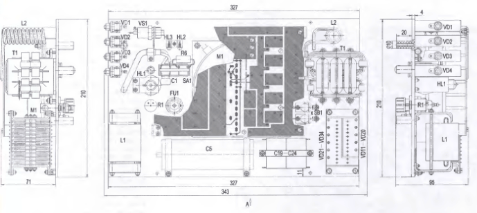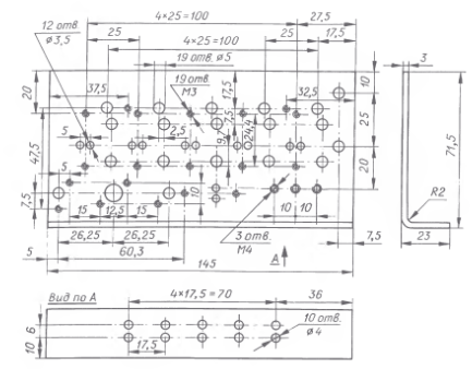 В пластине просверлены отверстия с резьбой для сборки ее с печатной платой и крепления элементов. Через отверстия без резьбы пропущены выводы деталей и соединительные провода. Через отверстия в отогнутом крае пропущены анодные выводы тринисторов. Три отверстия М4 в теплоотводе предназначены для его электрического соединения с печатной платой. Для этого использованы три латунных винта с латунными гайками. После окончательной регулировки аппарата соединение пропаивают.