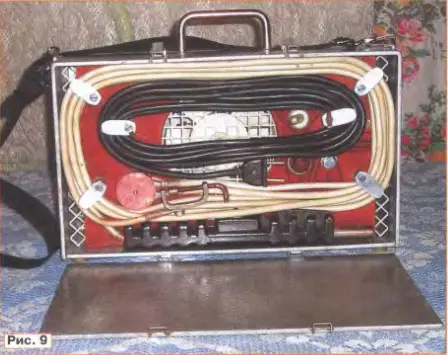Собранное основание помещено в кожух с крышкой, изготовленный из листового текстолита (можно использовать гетинакс, стеклотекстолит, винипласт) толщиной 3...4 мм. Отверстия для выхода охлаждающего воздуха расположены на боковых стенках. Форма отверстий значения не имеет, но для безопасности лучше, если они будут узкими и длинными. Общая площадь выходных отверстий не должна быть менее площади входного. Кожух снабжен ручкой и плечевым ремнем для переноски. Внешний вид аппарата с уложенными кабелями представлен на рис. 9.