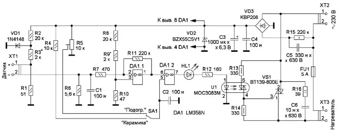 Убеждаются, что светодиод HL1 светит, а на разъёме ХТ3 присутствует напряжение 230 В. Если этого напряжения нет, надо замкнуть выводы светодиода и проверить напряжение на разъёме ХТ3. Если это напряжение появилось, сопротивление резистора R12 слишком велико и надо установить резистор с меньшим сопротивлением. Переключаются в режим работы "Подогреватель" и сравнивают напряжение на неинвертирующем входе ОУ DA1.1 с напряжением на левом по схеме выводе резистора R7, первое должно быть не намного больше второго. Если это не так, то либо в монтаже ошибка, либо необходимо изменить сопротивление резистора R3. При положении движка подстроечного резистора R5 в верхнем по схеме положении напряжение на выходе ОУ DA1.2 должно быть близко к нулю, светодиод HL1 гореть не должен, а на разъёме ХТ3 не должно быть напряжения сети. По мере вращения движка подстроечного резистора R5 светодиод должен загореться, а на разъёме ХТ3 - появиться напряжение сети 230 В.