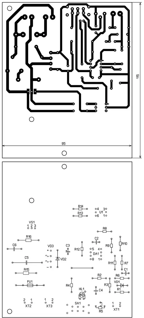 Чертёж печатной платы, изготовленной из одностороннего фольгированного стеклотекстолита толщиной 1,5 мм, показан на рис. 2. При изготовлении терморегулятора использованы постоянные резисторы МЛТ, С2-23, подстроечный - СП5-2. Оксидный конденсатор - импортный, остальные - плёночные серии К73-17. ОУ LM358N в корпусе DIP8 можно заменить аналогичным других производителей. Симистор установлен на теплоотвод, представляющий собой дюралюминиевую пластину любого пригодного для платы размера, разъёмы ХТ1-ХТ3 - клеммники DG340-3.81-02P-12-00AH, переключатель - движковый двухпозиционный, диодный мост KBP208 можно заменить подходящим по корпусу с максимальным прямым током не менее 2 А и с допустимым обратным напряжением не менее 400 В. Стабилитрон BZX55C5V1 можно заменить другим маломощным с номинальным напряжением стабилизации 5,1 В. Плавкая вставка FU1 - ВПБ6-13 5А (S1014, 5,2х х20 мм стекло), 250 В.