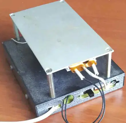 Рабочая температура поверхности нагревателя составляет 250±10 оС, что вполне достаточно для оперативной замены вышедших из строя SMD-компонентов. Но такая высокая температура для некоторых типов плат недопустима или нежелательна, поэтому возможны несколько вариантов решения этой проблемы. Первый вариант - изготовить специальный держатель, который обеспечит расстояние несколько сантиметров от нагревателя до платы, и оснастить эту конструкцию полноценным микропроцессорным регулятором температуры с развитыми управлением и индикацией. Такой вариант приве-дён в [2], причём эта конструкция по своим параметрам близка к профессиональным подогревателям плат.