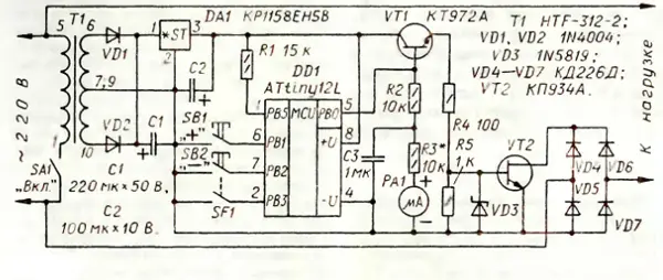 Регулирующим элементом служит БСИТ VT2. Канал этого транзистора включен в диагональ моста, собранного на диодах VD4-VD7. Открывающие импульсы на затвор транзистора поступают с выхода эмиттерного повторителя на транзисторе VT1. Линия РВО микроконтроллера DD1, с которого импульсы приходят на базу транзистора VT1, сконфигурирована как выход.