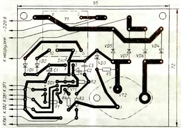 Все детали устройства, кроме кнопок SB1, SB2, контактов SF1, выключателя SA1 и указателя мощности РА1, установлены на печатной плате из фольгированного стеклотекстолита толщиной 1,5 мм. Чертеж платы показан на рис. 2.