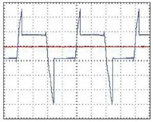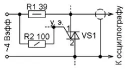 На рис. 1 приведена схема проверки симисторов, пригодная и для тиристоров. Осциллограмма на рис. 2 (синяя линия) показывает характер изменения напряжения между электродами 1 и 2 исправного симистора 2У208Г при импульсном токе в коммутируемой цепи около 0,13 А. Она почти симметрична относительно нулевой (красной) линии. При положительном напряжении на электроде 1 симистор скачком открывается при напряжении между главными электродами 2,5 В. При отрицательном напряжении между ними симистор открывается при напряжении -4 В. Падения напряжения разной полярности на симисторе в проводящем состоянии (на горизонтальных участках осциллограммы) немного различны по абсолютному значению - соответственно около +0,8 В и около -0,9 В.
