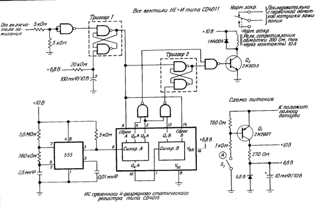 После того как схема установлена в рабочее состояние выключателем Si, при включении зажигания запускается триггер 1, собранный на двух вентилях НЕ-И, в результате импульсы 0,5 Гц с выхода таймера 555 поступают к сдвигающему регистру CD 4015. ИС CD 4015 содержит два четырехразрядных регистра, которые в данном случае соединены последовательно. Спустя 12 с (шесть импульсов) вентили НЕ-И открывают транзистор Q2, который размыкает нормально закрытые контакты реле и тем самым глушит двигатель. После того как в сдвигающий регистр поступят еще два импульса таймера, вентили НЕ-И закрывают транзистор Q2, разрешая повторный пуск двигателя.