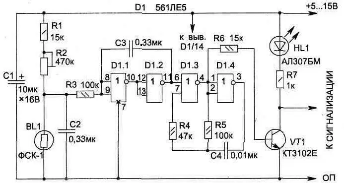Для сигнализации об ударах и вибрациях может использоваться также пьезосигнализатор типа В-2 (BQ1, рис. 5) совместно со схемой усилителя.