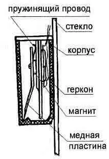 Чувствительности контактов геркона достаточно, чтобы он срабатывал на расстоянии 5...15 мм от магнита.