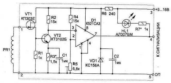 Чувствительность электромагнитного датчика колебаний не зависит от неровности места, и он может срабатывать даже от легкого прикосновения к машине, а его чувствительность легко изменить резистором R5 типа СП5-2В (так, во время дождя она должна быть снижена для исключения ложных срабатываний).