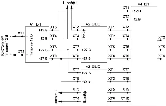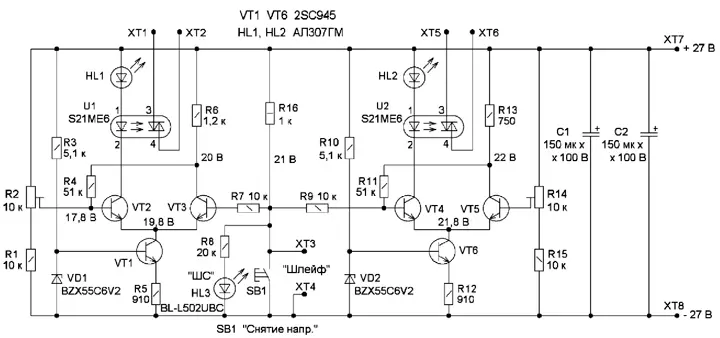 Схема одного БШС показана на рис. 2. Питание на него (27 В) поступает от БП. Шлейф подключается к контактам ХТ3, ХТ4 через токоограничивающий резистор R16. В дежурном режиме с оконечным резистором 4,7 кОм и с извещателями напряжения на ШС - около 21 В. Параллельно шлейфу подключён узел индикации выходного напряжения на светодиоде HL3 и резисторе R8. Некоторым извещателям после срабатывания для возврата в дежурное состояние необходим полный сброс напряжения питания (не менее 3 с). В блоке это происходит путём замыкания ШС кнопкой SB1. На транзисторах VT1-VT6 собраны два узла сравнения на основе несимметричных дифференциальных усилителей.