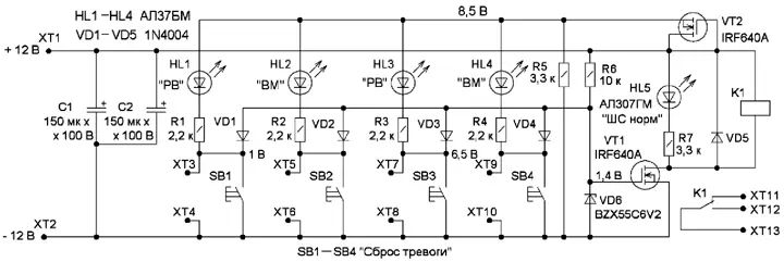 При постоянном или кратковременном нарушении состояния ШС открываются один или все фотосимисторы в БШС. Напряжение на затворе транзистора VT1 в БЛ уменьшается, и он закрывается. Реле К1 подключает тревожный сигнализатор, светодиод HL5 "ШС норм." гаснет. После устранения причины срабатывания ПКП сначала нажатием (не менее 3 с) на кнопку SB1 в БШС этот блок возвращается в дежурное состояние, а потом нажатием на соответствующую кнопку SB1-SB4 выключают сигнал тревоги.