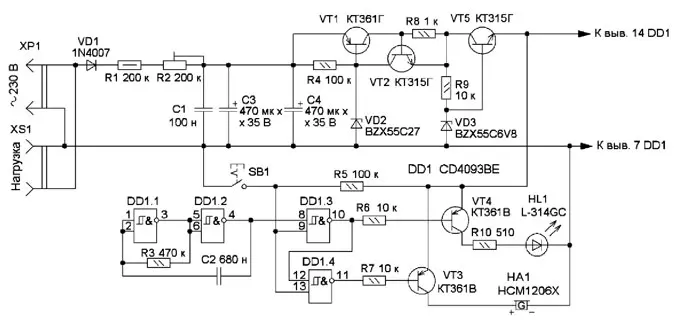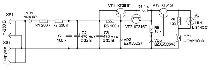 Сигнализатор предназначен для периодической подачи звукового и светового сигналов при подключении к сети. Он найдёт применение для людей, забывающих выключать различные бытовые электроприборы. Схема сигнализатора показана на рис. 1. После подачи напряжения сети сигнализатор выдаёт пачки коротких импульсов звукового и светового сигналов с паузой 15...30 с. Сетевое переменное напряжение выпрямляет диод VD1, и через резисторы R1 и R2 заряжаются конденсаторы C1, С3, С4. Аналог тиристора собран на элементах VT1, VT2, VD2, R4, R8. Когда напряжение на конденсаторах С1, С3, С4 достигнет около 27 В, стабилитрон VD2 открывается, аналогтиристора тоже открывается и напряжение поступает на стабилизатор напряжения 6 В, собранный на элементах VT5, VD3, R9. С его выхода питающее напряжение поступает на генератор импульсов, собранный на элементах DD1.1, DD1.2, R3, C2. Далее прямоугольные импульсы поступают на элементы DD1.3, DD1.4, которые управляют транзисторами VT3, VT4. В коллекторную цепь первого включён акустический сигнализатор HA1 со встроенным генератором. В коллекторную цепь второго включены светодиод HL1 и токоограничивающий резистор R10. Поэтому, когда работает генератор, попеременно подаются звуковой и световой сигналы. Это обеспечивает постоянное протекание тока через аналог тиристора, и он остаётся в открытом состоянии.