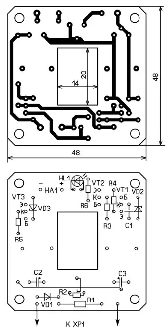 Сигнализатор можно упростить, исключив из неё генератор импульсов. Схема такого варианта показана на рис. 2. Работает он аналогично, только после отрывания аналога тиристора выдаётся не серия коротких сигналов, а одиночные более продолжительные звуковой и световой сигналы. Более простая схема позволяет разместить все детали на печатной плате, которую можно установить в розетке. Чертёж платы упрощённого сигнализатора, которая изготовлена из одностороннего фольгированного стеклотекстолита толщиной 1,5 мм, показан на рис. 3.