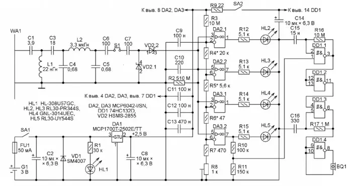 Напряжение 2,5 В питает генератор звукового сигнала на микросхеме DD1 и применённые в качестве компараторов напряжения ОУ микросхем DA2 и DA3. Использованы сдвоенные ОУ MCP6042-I/SN - микромощные (напряжение питания 1,4...6 В, ток потребления менее 1 мкА на один ОУ) с допустимым интервалом входного и выходного напряжения, включающим потенциалы выводов питания. Их высокое входное сопротивление позволяет работать с высокоомными источниками входных сигналов. Антенна WA1 - готовая от сотового телефона Siemens S65, работающего в диапазонах 900, 1800 и 1900 МГц. Из него же взяты элементы входного фильтра C1, C3-C5, L1, L2.