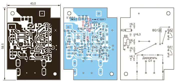 Все светодиоды - ультраяркие в корпусах диаметром 3 мм. HL-308U57GC (HL1) - зелёного цвета свечения номинальной яркостью 6 кд, остальные - номинальной яркостью 1 кд: RL30-PR344S (HL2, HL3) - красного цвета, GNL-3014UEC (HL4) - оранжевого, RL30-UY544S (HL5) - жёлтого. Чем выше номинальная яркость используемых све-тодиодов, тем большего сопротивления могут быть добавочные резисторы R1, R12-R15, что уменьшает потребляемый ток.