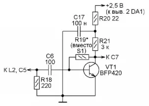 Чтобы увеличить чувствительность индикатора, на его печатной плате предусмотрено место для установки деталей дополнительного входного усилителя, схема которого показана на рис. 5. Его собирают на транзисторе BFP420 с граничной частотой 25 ГГц и коэффициентом шума 1,1 дБ на частоте 1,8 ГГц при токе коллектора 5 мА. Подборкой заменяющего перемычку S1 резистора R19 необходимо установить постоянное напряжение между коллектором и эмиттером транзистора равным 1,25 В (половине напряжения питания).