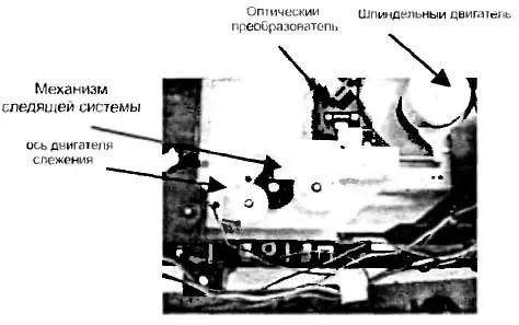 Проверяют исправность шестерен и направляющих штифтов, по которым движется ОП (рис. 4). Проверяют плавность перемещения ОП по направляющим. Если перемещение ОП идет рывками, протирают направляющие оси и смазывают их специальной силиконовой смазкой. Проверяют исправность двигателя следящей системы, измеряют тестером сопротивление его обмоток (должно быть около 20 Ом). Подключают двигатель к источнику постоянного напряжения 5 В, меняя полярность. При этом двигатель должен равномерно вращаться в обоих направлениях. В противном случае, его заменяют. Если двигатель неисправен, проверяют его схему управления (драйвер). При перемещении двигателя размах напряжения на выв. 17 и 18 U302 должен быть не менее 100 мВ (при напряжении питания 2,5 В). Если это напряжение занижено, микросхему заменяют. Если напряжение равно нулю, проверяют поступление сигнала FMSO на выв. 23 U302 от контроллера DVD (выв. 19). Отсутствие этого сигнала от контроллера может указывать как на неисправность самого контроллера (например, на его перегрев), так и на проблемы с фокусировкой.