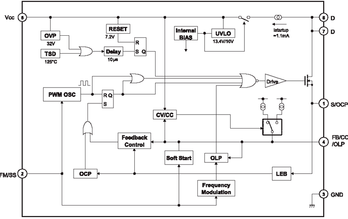 - встроенные схемы защиты: по току (ОСР), от коротких замыканий и низких сопротивлений нагрузки (OLP), от высокого (OVP) и низкого напряжений (UVLO), от перегрева (TSD).