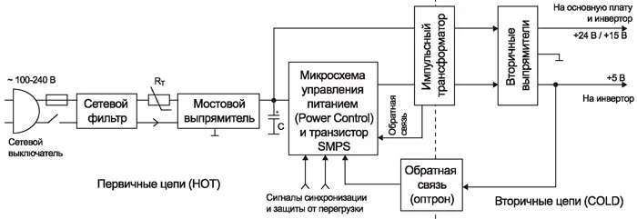 Постоянное напряжение подается на последовательно включенные первичную обмотку импульсного трансформатора и мощный ключевой полевой транзистор SMPS (Switch Mode Power Supply), находящийся в микросхеме управления питанием (Power Control). Эта микросхема обеспечивает задание частоты следования импульсов и их длительности для регулировки выходных напряжений по закону ШИМ (PWM - Power Wide Modulation). Сигналы обратной связи поступают на микросхему управления со специальной обмотки трансформатора и от источника выходного вторичного напряжения +5 В через элемент гальванической развязки, в качестве которого используется оптрон. На микросхему управления поступают также сигналы синхронизации и защиты от перегрузки.