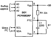 Причину этого можно объяснить следующим: внутренняя архитектура микросхемы PCF8582 несколько отличается от архитектуры микросхем серии 24сХХ и требует при проведении операции записи в ячейки памяти дополнительного сигнала синхронизации (выв. 7 микросхемы РТС). Разработчиками данной микросхемы предусмотрено 2 способа синхронизации узла стирания/записи микросхемы: